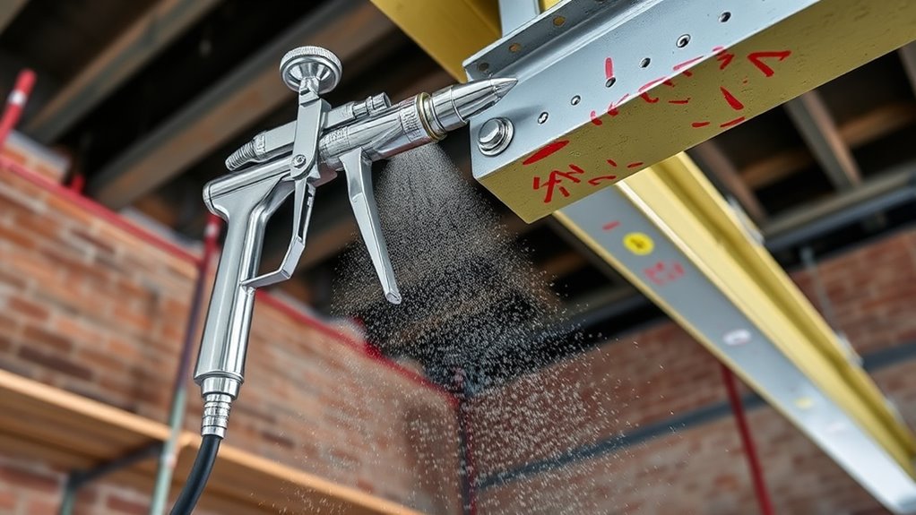 Furthermore, the versatility of spray application makes it suitable for various surface types, including beams, columns, and intricate architectural features. It allows you to reach difficult areas efficiently, saving time compared to manual brushing or rolling. As long as you choose a sprayer compatible with fireproofing coatings and master the proper spray application techniques, you’ll achieve a professional, durable finish that enhances the fire resistance of your structures. Remember, consistent training on spray methods and understanding your equipment’s capabilities will maximize the effectiveness of your fireproofing efforts. This approach ensures your structures are better protected against fire, providing peace of mind and compliance with safety standards.