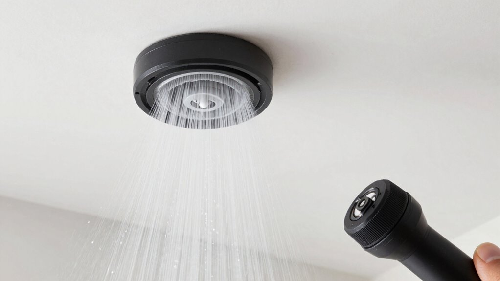 To select the appropriate spray nozzle for ceiling work, you should consider the spray nozzle types and spray pattern selection. Choose a nozzle that offers adjustable spray patterns, like a fan or wide-angle nozzle, to guarantee even coverage and minimize spatter. Focus on nozzles designed for ceilings, which provide a consistent spray without drips. Testing different nozzles beforehand helps you find the best pattern for a smooth, professional finish.