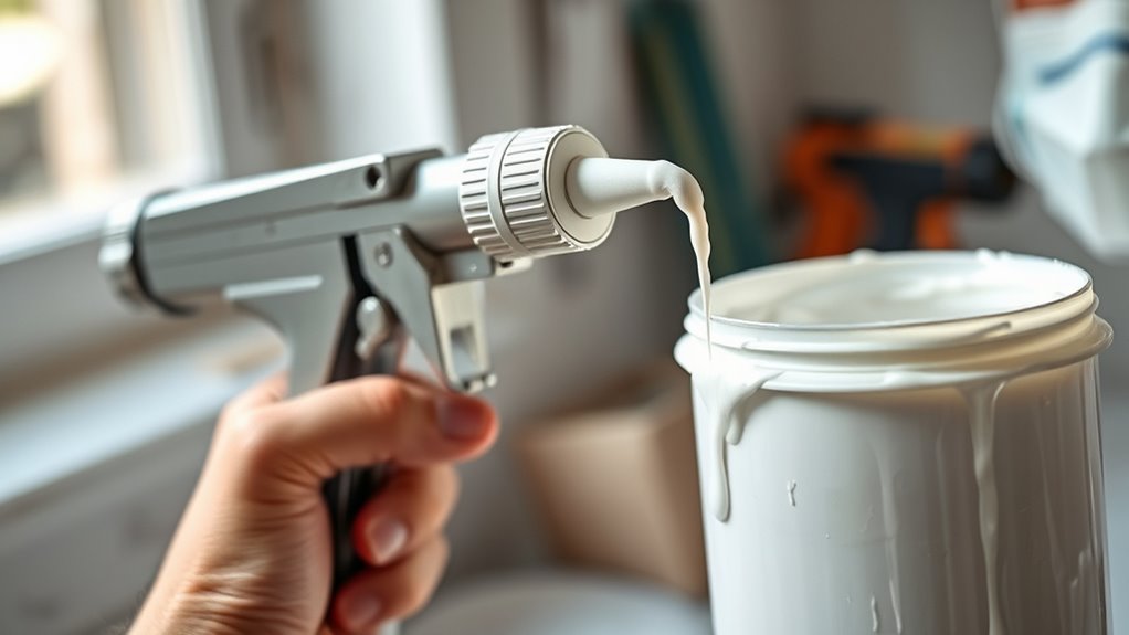 When you’re ready to thin the paint, use the appropriate thinner—usually water for latex paints or a solvent like mineral spirits for oil-based paints. Always add thinner gradually, about 10% at a time, and mix thoroughly. This gradual approach helps you fine-tune the paint’s consistency without over-thinning. Keep testing the viscosity by running the paint through a strainer or pouring it into a container and observing how it flows. Additionally, understanding the ideal viscosity for your specific sprayer can help you achieve the best results.