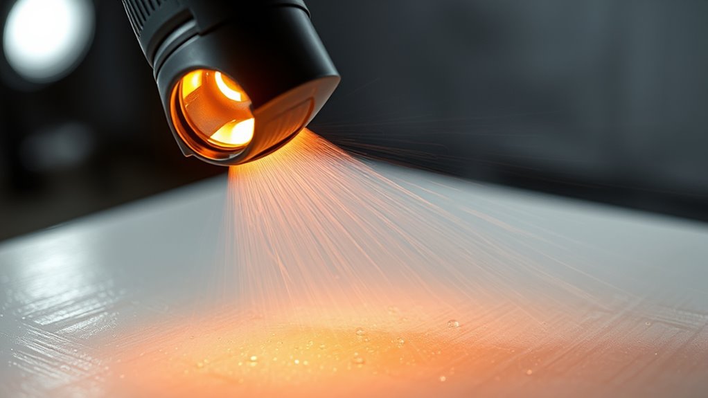 Using heat guns and drying aids after spraying can speed up your drying and curing process, helping to achieve a smooth, durable finish. By applying gentle, controlled heat, you can reduce trapped moisture and prevent issues like bubbling or uneven textures. Just keep the heat moderate and move the gun steadily to avoid damage. If you want to learn how to use these tools properly for the best results, keep exploring these tips.
