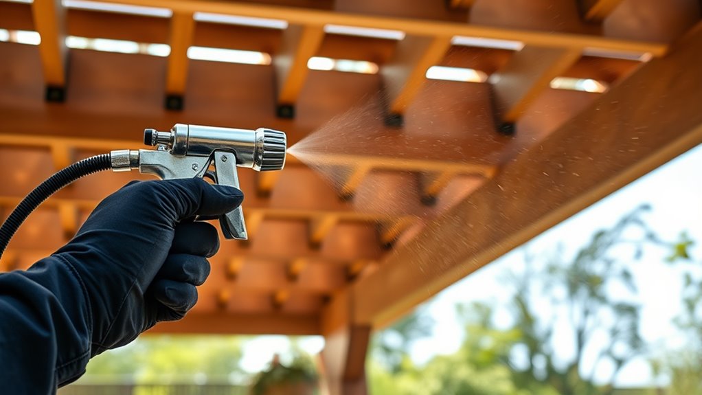 To spray lattice and pergolas, start by cleaning and drying the surfaces thoroughly. Set up your sprayer outdoors or in a well-ventilated area, testing it on scrap wood first. Hold the spray wand 6-12 inches from the surface and use steady, overlapping strokes, working from top to bottom. Apply multiple thin coats for durability, allowing each to dry completely. For detailed areas, use a brush or roller. Following these steps will help you achieve a smooth, long-lasting finish—keep going to learn more!