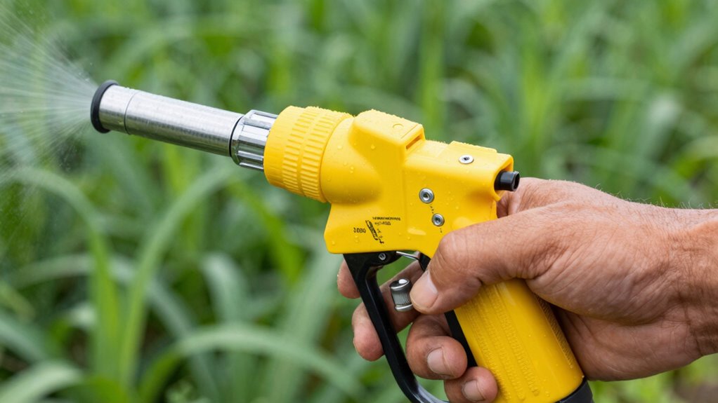 Another critical aspect is nozzle selection. The type of nozzle you use influences droplet size, spray pattern, and flow rate, all of which impact coverage and efficiency. For quick calibration, start by choosing a nozzle suited for your specific application—whether it’s a fine mist for herbicides or a more targeted stream for pesticides. You want a nozzle that delivers a consistent flow and pattern, so your calibration results are reliable. Once you’ve selected the right nozzle, make sure it’s clean and free of clogs, as debris can alter flow rates and spray patterns. Keep spare nozzles handy for quick swaps if needed. Proper nozzle selection combined with regular cleaning ensures the spray pattern remains uniform, reducing the chances of over-application or missed spots.