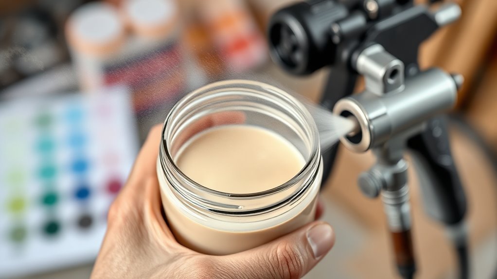 No, you can’t use the same thinning technique for all paint types. Different paints require specific paint consistency and thinning ratios to spray properly. Latex, oil-based, and specialty paints each have unique needs, so adjust the thinning ratio accordingly. Always test a small amount first to guarantee proper flow and finish. Using the wrong ratios can lead to uneven coverage or clogging, so tailor your approach for each paint type.