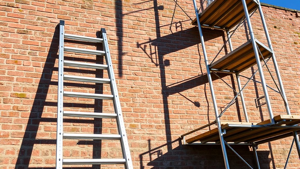 When it comes to height restrictions, you need to weigh your options carefully. If the wall is too tall, a scaffold is usually your best bet because it offers better structural stability and allows you to work safely at greater heights. Ladders can be risky if height considerations exceed safe limits, making it a case of “playing it by ear.” Prioritize safety and choose the option that keeps you balanced and secure.