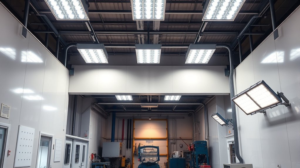 Proper lighting in spray booths and job sites is vital for safety, control, and quality. Bright, consistent LED fixtures help you spot imperfections, reduce eye strain, and minimize shadows. Choosing explosion-proof or hazard-rated lights guarantees safety in fumes or flammable environments. Regular maintenance and strategic placement optimize visibility and prevent accidents. If you want to learn more about creating a safe, efficient workspace, keep exploring this essential role of lighting.