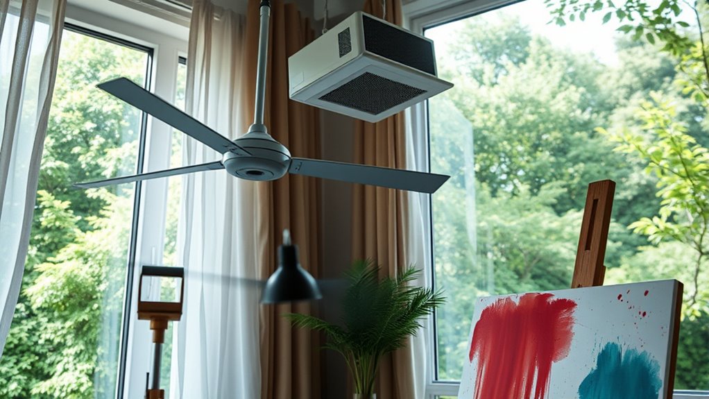 Imagine you’re a modern-day Da Vinci. For spray painting, you should choose ventilation systems with strong exhaust fans and air filtration. These systems effectively remove fumes and odors, making your workspace safer. Look for setups that include high-capacity exhaust fans and HEPA filters, which trap harmful particles. Properly designed ventilation maintains fumes at bay and ensures fresh air, so your creative process stays safe and enjoyable.