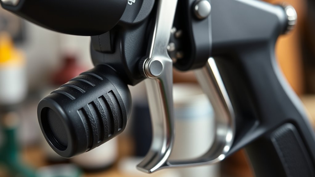 Imagine you’re painting a car and notice improved control with a custom grip. Custom grip materials, like rubber or silicone, can decrease fatigue and enhance comfort, leading to better spraying accuracy. Adjusting the trigger position ensures you can maintain steady, precise application. These modifications help you stay consistent, especially over long sessions, ultimately improving your spray quality and efficiency.