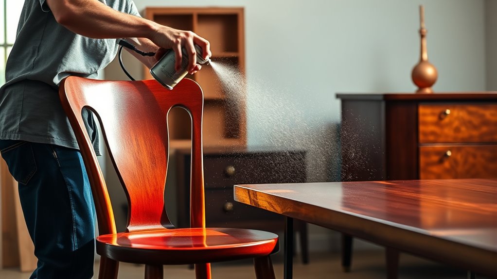 To spray furniture like chairs, tables, and dressers, start by choosing the right color and preparing the surface with cleaning and sanding. Use a quality spray gun or aerosol spray, holding it 6-12 inches from the piece, and apply multiple thin coats with smooth, overlapping strokes. Maintain a steady hand and consistent technique to avoid drips and streaks. If you want to master these tips and create a professional finish, keep exploring for more insights.
