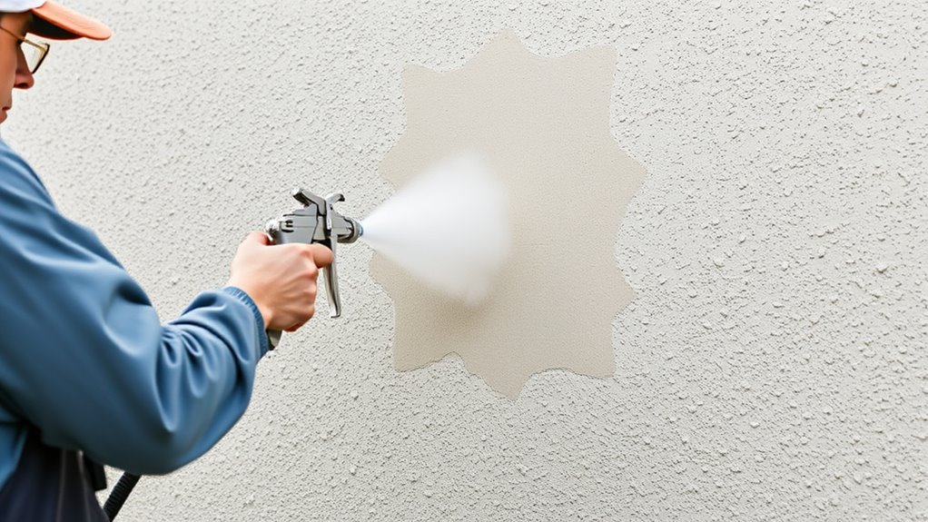 To blend stucco repairs seamlessly, focus on matching the existing color and texture through careful testing of small batches before application. Use consistent spraying techniques, maintaining a steady distance and overlapping passes for even coverage. Keep your equipment clean and well-maintained to guarantee uniform spray patterns. Pay attention to blending as you go, adjusting your mixture and technique. For more tips on achieving flawless results, stay tuned to learn how proper equipment care and detailed application make all the difference.